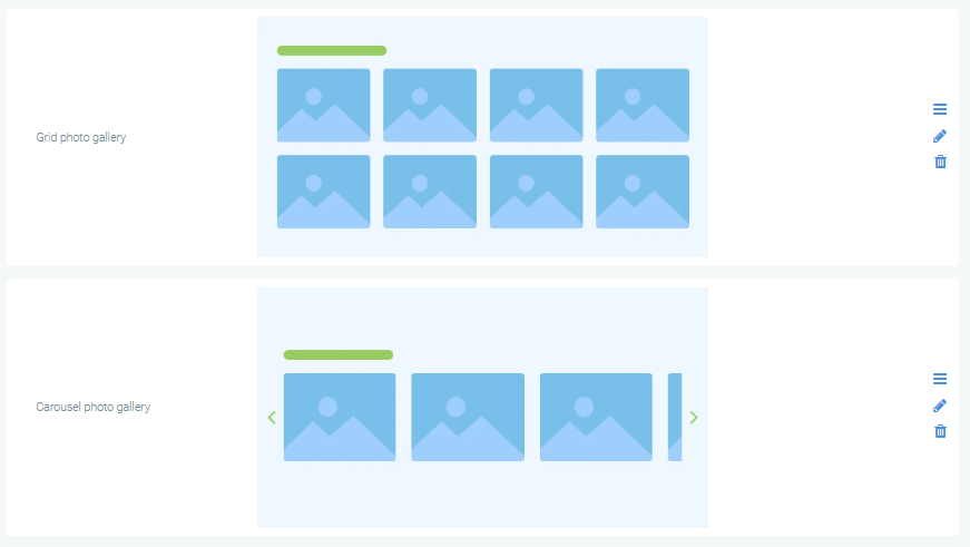 Adicionando mais versatilidade ao conteúdo geral das páginas agora você pode adicionar Depoimentos de Clientes e Galerias de Fotos, disponíveis nos modos grade e carrossel.